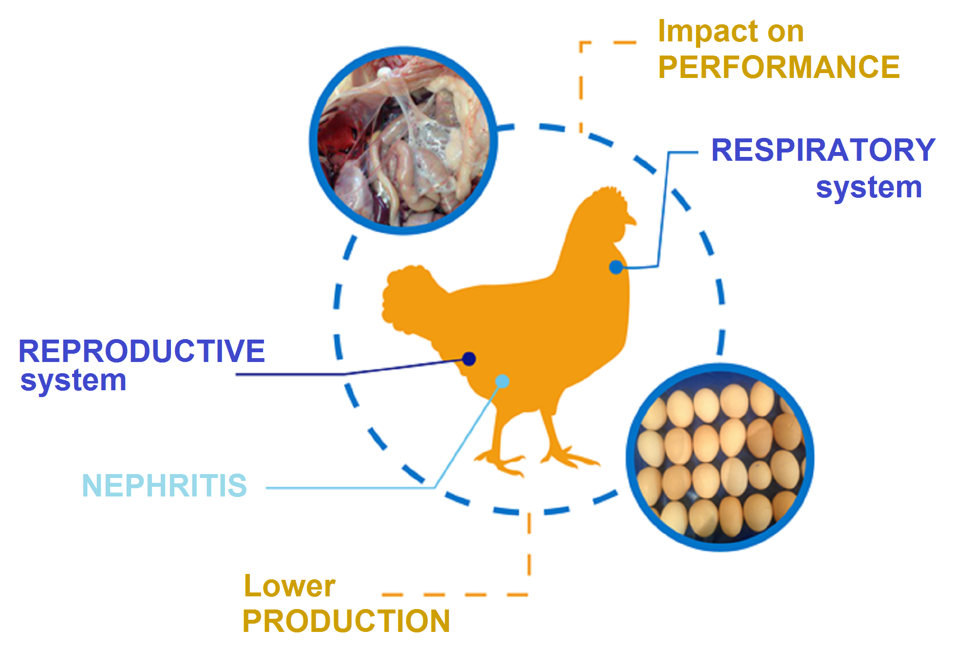 One of the most important steps for the control of a disease in poultry production is to ensure accurate diagnosis. Infectious Bronchitis (IB) should be distinguished from other clinical diseases causing respiratory signs and lesions, Nephrosonephritis and impact in egg production and quality.