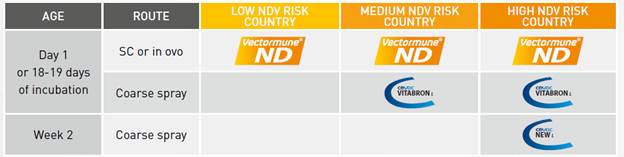 In high challenge areas, where ND outbreaks bring unacceptable losses, Vectormune® ND has proven marked superiority as compared to any conventional vaccine as it evades MDANDV, can be applied in the hatcheries (i.e. well controlled environment with well trained workers), it induces long-lasting immunity and significantly reduces the shedding. In fact, this vector vaccine has all these advantages without inducing any post-vaccination reactions.