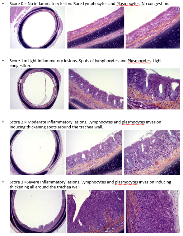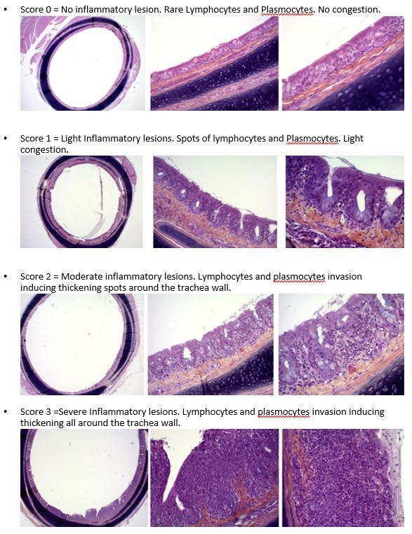 Complete trachea samples from the larynx to the bifurcation of the bronchi were taken. Histological evaluation ranges from 0 (no inflammatory lesion) to 3 (severe inflammatory lesions). Previously a control necropsy was performed to verify the absence of lesions.