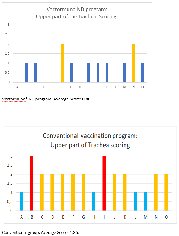 The conventional vaccine program birds clearly showed a higher level of inflammatory lesions both in the lower and upper tract of the trachea than in the group of birds also vaccinated with Vectormune® ND.